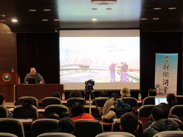 讲座在歌曲《天路》的优美旋律中开始,段炼老师给到场同学们依序播放了用行车记录仪拍下的精彩视频。这些视频记录了段炼老师一行从出发到返回的见闻和美景,让同学们领略了西藏之美和进藏之艰。段炼老师还特别用图片为大家展示了进藏道路上所看到的美丽风景,那些蓝天白云和朴实藏民都让他一生难忘。由于道路过于泥泞,返回的过程更加艰难,甚至出现了汽车底盘被磨坏的意外情况,但是段炼老师说为了实现自驾去西藏这个怀揣了十年的梦想,这些困难都是值得的!