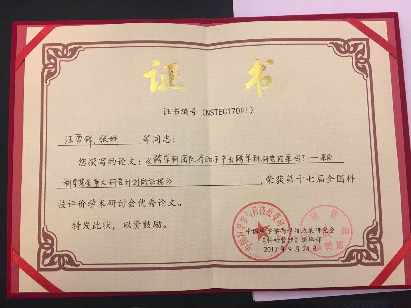 2017年9月23-24日,beat365在线唯一官网登录知识管理与数据分析实验室2016级硕士生张娇在第十七届全国科技评价学术研讨会上获得优秀论文奖,并被组办方选择作为热点话题之一进行单独汇报讨论,受到与会学者的广泛关注,这也是实验室研究生连续第三年获此殊荣,进一步提升了我校在技术创新管理和科技评价领域的影响力,为我校赢得广泛赞誉。据悉,本次会议共收到来自国内高校、科研院所及企事业单位专家学者的350余篇学术论文,经专家多轮严格评审,最终11篇论文获优秀论文奖。中国科学学与科技政策研究会理事长穆荣平研究员,《科研管理》编辑部王萍主任为获奖作者颁发优秀论文证书。