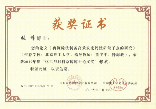 10月17日至20日,2019中国化工学会年会在滨海城市山东青岛召开。在此会议上,2019年度化工与材料京博博士论文奖举行了颁奖仪式,材料学院2018届博士毕业生张峰斩获银奖,为beat365在线唯一官网登录材料学院在学会优博的荣誉榜上增添了亮丽的一笔。本次所获银奖的博士论文题目是“再沉淀法制备高效发光钙钛矿量子点的研究”,指导教师是董宇平教授和钟海政教授。