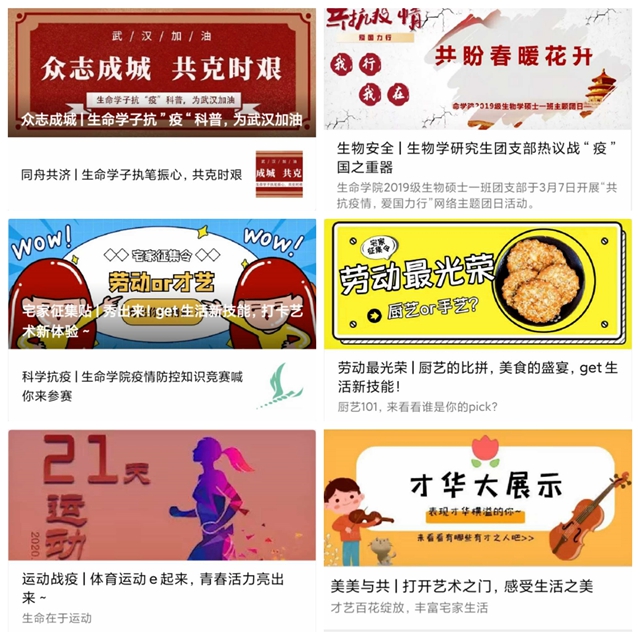 2020年初以来,面对突如其来的新冠肺炎疫情,学校做出“延期开学不停课”的工作部署。生命学院在认真落实疫情防控各项要求,在及时准确掌握学生群体防控信息的同时,抓牢抓好立德树人根本任务,注重加强学生思想引导、心理疏导、行为指导,创新方式方法,利用各种远程手段,实施“德智体美劳”五育“云端”行动,开展了“众志成城、共克时艰”网络主题教育活动、疫情防控知识竞赛、“同心抗疫、运动不能停”21天运动打卡“战疫”活动、“get生活新技能、打卡艺术新体验”劳育和美育等活动,丰富学生居家学习生活,助力学生成长发展。