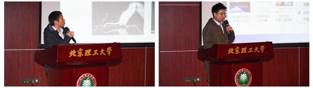 成立仪式结束后,石青以“智能仿生机器鼠研究进展”为主题,围绕团队研制出的智能微小型仿生机器鼠,重点介绍了仿生建模、优化与评估,仿生微感知单元及机器鼠-动物仿生交互等内容,展示了基于形态功能仿生到交互仿生探索的成果,并就如何使仿生机器人从形似到神似进行了探讨。智能无人系统队项目导师、北理工机电学院副教授王化平以“智能机器人研究进展与大学生科创培养”为主题,围绕仿生机器人、医疗机器人、类生命机器人、微纳机器人等当前机器人领域研究热点,介绍了智能机器人研究进展与成果;以大学生参与机器人领域科研项目为切入点,介绍大学生如何融入实验室科学研究、如何依托科研项目开展科技创新活动并产出科技创新成果。