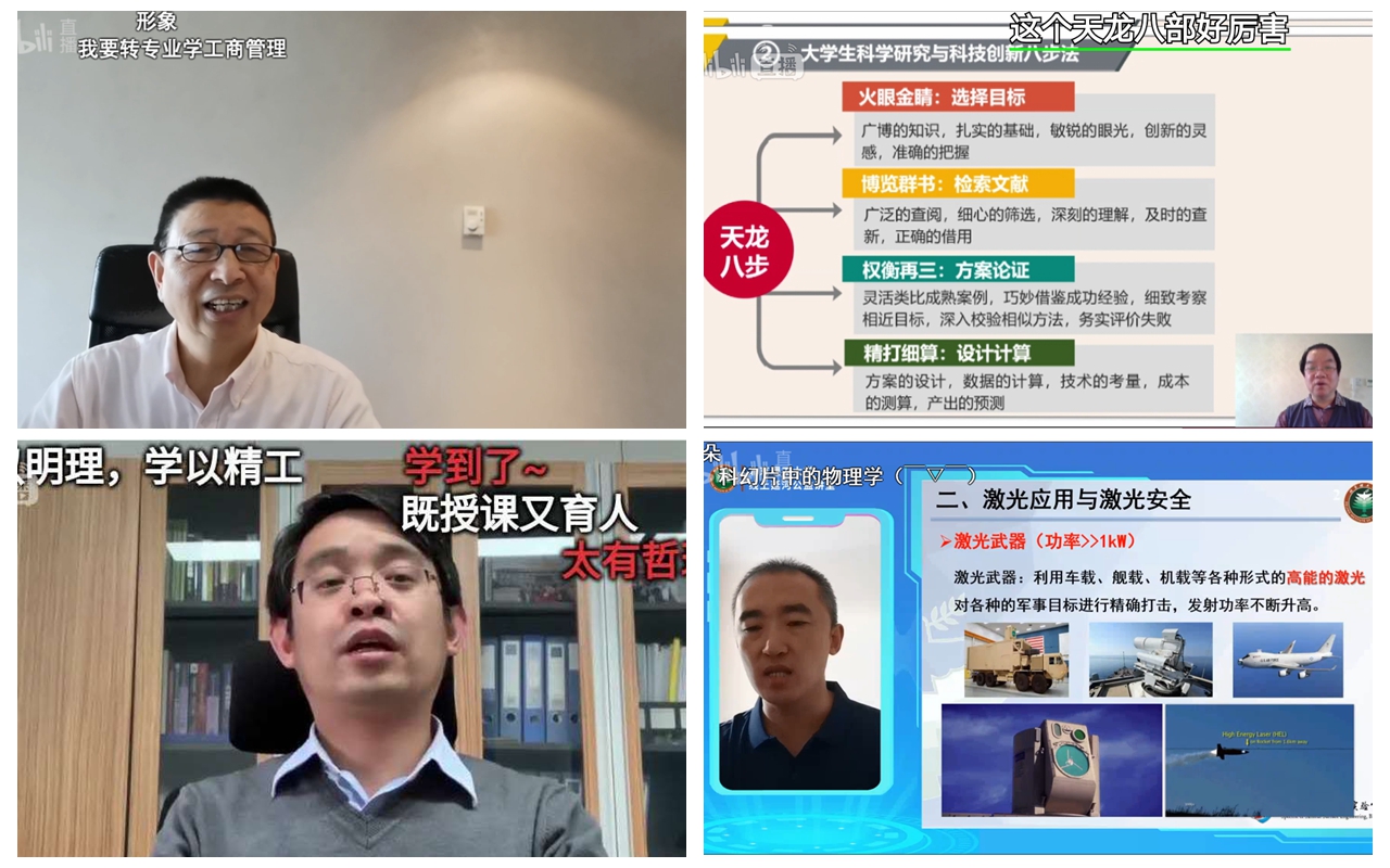 管理与经济学院韩伯棠教授以“田忌赛马”为引,详细解读了工商管理中的科学问题,虽年过七旬但声如洪钟,慷慨激昂地感染着每一位观众;机电学院罗庆生教授结合团队实战经验和典型案例,讲述了高校双创人才培养的“天龙八步”法则,生动形象的演绎讲授,不仅为双创学子释疑解惑,还让双创导师收获满满;自动化学院孙健教授围绕自动控制技术,带领师生公众从亚历山大时期穿越至21世纪,共同探讨自动控制的起源与发展,丰富的诗词引用让网络课堂喝彩连连;材料学院马壮教授结合被称为“最快的刀”“最准的尺”“最亮的光”的激光技术,为大家介绍高能激光会对材料和装备造成什么样的损伤,共同探讨保证装备安全的特种防护材料技术,视频动画等案例的完美结合让课程质量倍增……