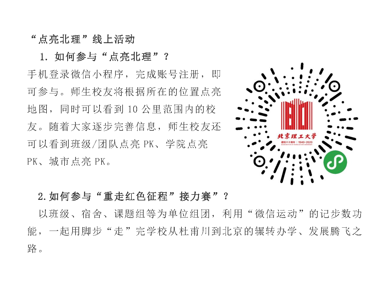 在beat365在线唯一官网登录建校80周年之际,北理工校友会推出“红色征程 点亮北理”活动,号召全球北理工人传承红色基因,与师友通过“点亮北理”小程序的记步数功能,同心同向同行,云上共同“走”完学校从杜甫川到北京的辗转办学、发展腾飞之路,一路接力奔向北京,共贺母校八十华诞!