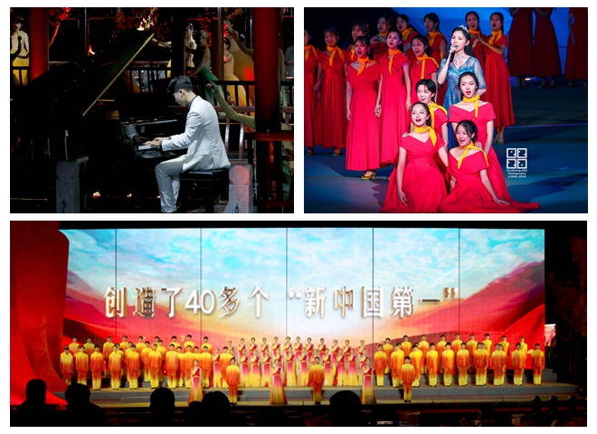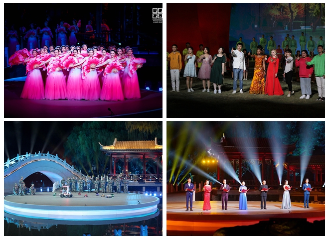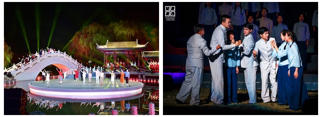 伴随着柔和的灯光、动情的旋律,序幕“延安根”开启。一曲《我爱你中国》唱出了同学们的赤子心声,水榭里、石桥上、舞台中,来自学校各个学院的师生们用饱含深情的话语为母校献上由衷的祝福。情景故事《梦回延安》将观众带到80年前的延安,上百名演员通过讲述、歌唱和形体表演等形式再现自然科学院创建及校址迁移时期的场景。
