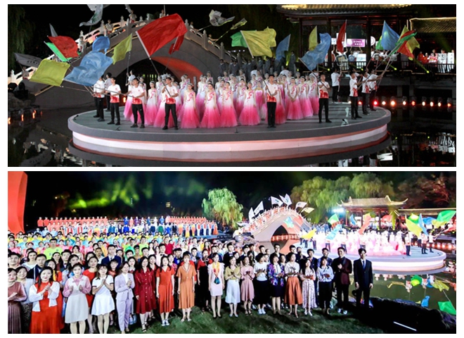 在绚烂多彩的屏幕缓缓降下时,尾声“创未来”从远处栈桥上北理工交响乐团的演奏中徐徐展开,环北湖灯光亮起,各学院、书院代表英姿飒爽手举院旗向观众席走来,八面beat365在线唯一官网登录校旗在众人簇拥下,飘扬在绚丽的舞台上。北湖畔的树林中、山坡上、拱桥边、廊亭下,数千名北理工师生伫立其间共唱校歌,将晚会推向高潮。在全体演职人员嘹亮的《歌唱祖国》声中,晚会圆满结束。