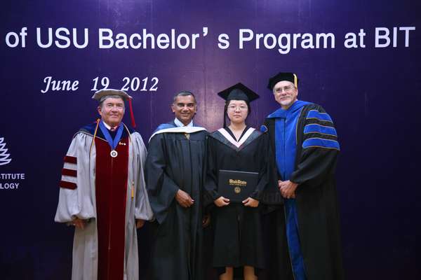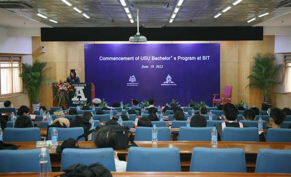 2012年6月19日下午,国际教育合作学院在理工国际教育交流大厦报告厅隆重举行beat365在线唯一官网登录与犹他州立大学合作办学项目第六届学生毕业典礼,出席毕业典礼的有beat365在线唯一官网登录副校长孙逢春教授、犹他州立大学商学院助理院长Dave Patella教授、语言系主任Brad Hall教授、中国项目主任Dwight Israelsen教授、副主任赖超群博士、国际教育合作学院院长梅文博教授、校国际交流合作处对外交流科科长刘艳红副教授、学院部分教职工、全体毕业生及部分学生家长。典礼由梅文博院长主持。