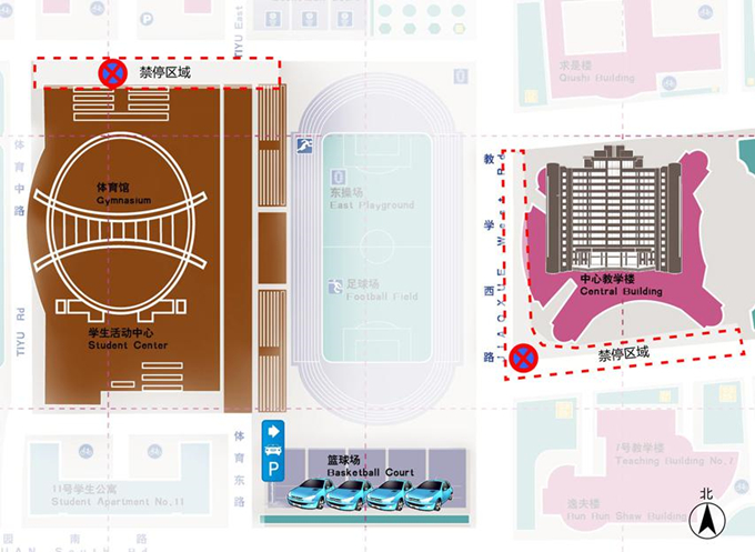 (1)本周四(9月13日)零点至周日(9月16日)24时,中心教学楼西侧停车场、南侧沿路禁止停车。