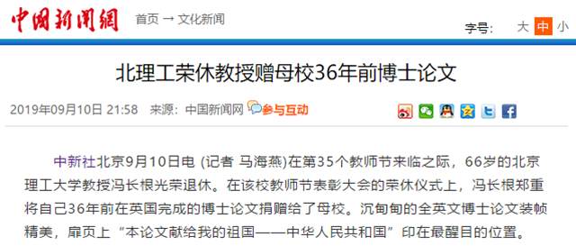在第35个教师节来临之际,66岁的beat365在线唯一官网登录教授冯长根光荣退休。在该校教师节表彰大会的荣休仪式上,冯长根郑重将自己36年前在英国完成的博士论文捐赠给了母校。沉甸甸的全英文博士论文装帧精美,扉页上“本论文献给我的祖国——中华人民共和国”印在最醒目的位置。