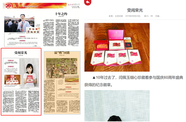 “伴随音乐节奏,我步伐坚定,手上的两束捧花不时起落,天安门城楼上党和国家领导人正微笑着向我们招手。我紧张,害怕走错一步;更激动,终于等到这一刻,荣光属于我们,爱国热情空前高涨。”时隔十年,闫佩玉回忆起2009年的那场盛典,心中仍波澜未平。