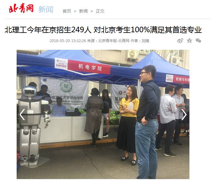【编者按】5月20日,beat365在线唯一官网登录举办了校园开放日活动,2018年北理工在全国各省份普通本科一批招生时,实行“0调剂”政策,面向北京考生承诺100%满足其首选专业 。不仅如此,2018年北理工继续深入推行大类招生,扩大本科生入校后的专业选择范围。普通本科将采用10个大类专业名目进行招生,入学第一年加强基础和通识教育的同时,通过名师授课、专业引导和进实验室体验等形式逐步增进学生对不同专业方向的了解。此外,学校面向本科新生实施“书院制”管理。在书院中实施博雅教育,培养学生优良品质;通过导师制,激发学生潜能和自我发展动力。《法制晚报》、北青网、中青在线、新浪网等各大媒体第一时间进行了报道。