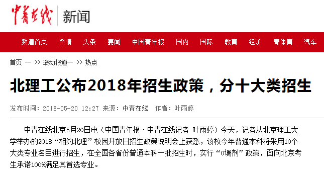 【中青在线】北理工公布2018年招生政策,分十大类招生