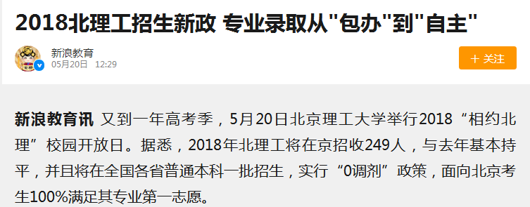 【新浪网】2018北理工招生新政 专业录取从"包办"到"自主"