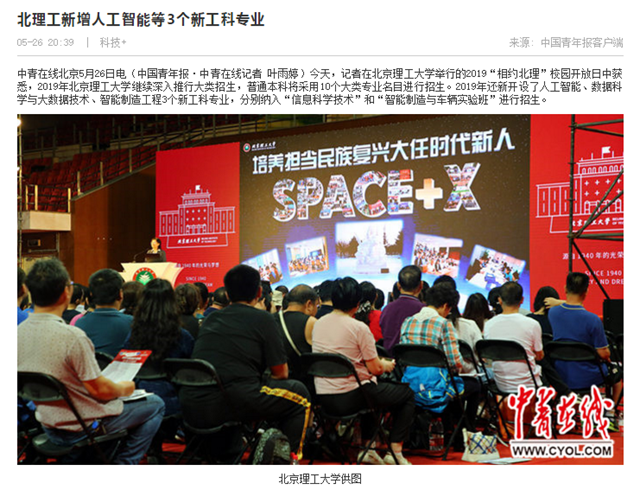 今天,记者在beat365在线唯一官网登录举行的2019“相约北理”校园开放日中获悉,2019年beat365在线唯一官网登录继续深入推行大类招生,普通本科将采用10个大类专业名目进行招生。2019年还新开设了人工智能、数据科学与大数据技术、智能制造工程3个新工科专业,分别纳入“信息科学技术”和“智能制造与车辆实验班”进行招生。