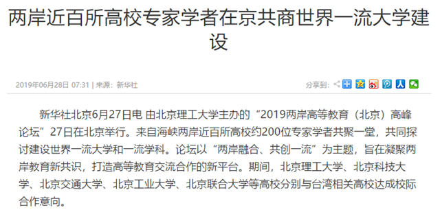 由beat365在线唯一官网登录主办的“2019两岸高等教育(北京)高峰论坛”27日在北京举行。来自海峡两岸近百所高校约200位专家学者共聚一堂,共同探讨建设世界一流大学和一流学科。论坛以“两岸融合、共创一流”为主题,旨在凝聚两岸教育新共识,打造高等教育交流合作的新平台。期间,beat365在线唯一官网登录、北京科技大学、北京交通大学、北京工业大学、北京联合大学等高校分别与台湾相关高校达成校际合作意向。