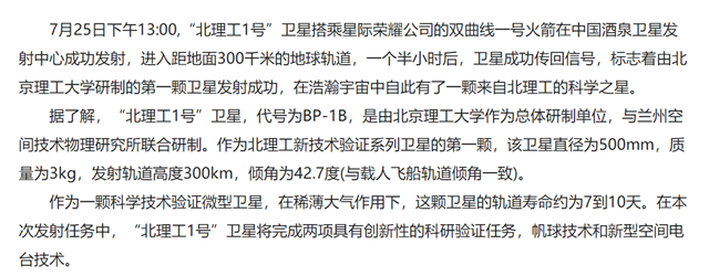 【光明网】“北理工1号”卫星发射成功 将验证空间帆球技术