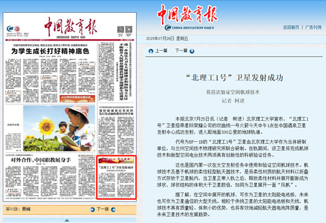 【中国教育报】“北理工1号”卫星发射成功
