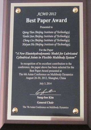 本次大会还颁发了2012年第6届ACMD会议的最佳论文奖(共3名,中国学者1名),由田强副教授等联合撰写的论文“A new Elastohydrodynamic Model for Lubricated Cylindrical Joints in Flexible Multibody System”获此殊荣。