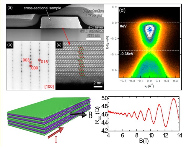 针对制备好的实验材料,选取一横断面样本,使用高角度环形暗场-扫描透射电子显微镜(HAADF-STEM)进行表征,可以清楚地观察到沿[100]带轴的五元组层(QL)的序列−Se−Bi-Se−Bi−Se−的基本单元。利用角分辨光电子能谱(ARPES,利用光电效应研究固体的电子结构)观察硒化铋(Bi2Se3)的表面态。