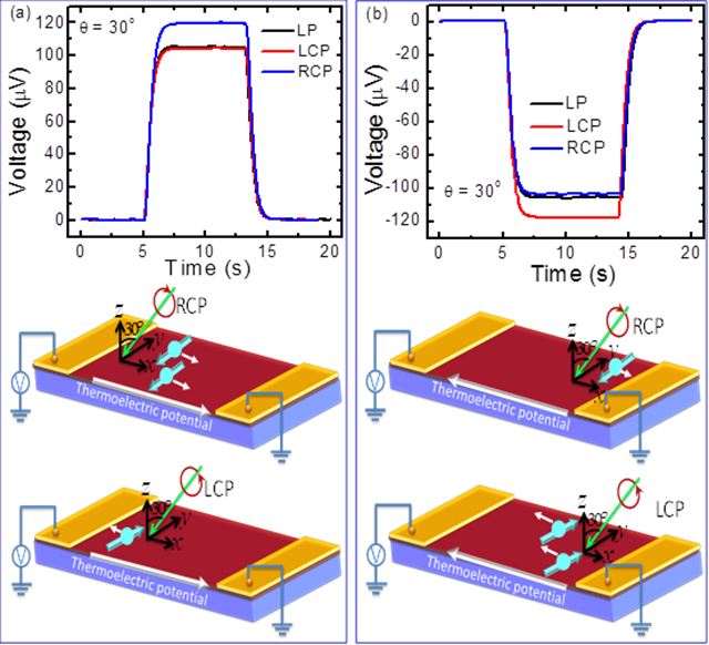 通过阿哈拉诺夫玻姆效应(Aharonov−Bohm,AB效应,证明电磁场的矢势有直接的可观测的物理效应)和舒勃尼科夫―德哈斯效应(Shubnikov-de Haas,SdH振荡,固体材料的电阻(磁阻)随磁场的倒数呈周期性振荡的现象)测出拓扑绝缘体表面的狄拉克费米子(满足狄拉克方程的费米子,费米子即自旋为半整数(1/2,3/2…)的粒子)性质。使用圆偏振光(CPL)来选择性激发硒化铋(Bi2Se3)表面态电子,产生自旋极化的表面态,由于自旋方向与动量方向的锁定关系,样品中会产生电子定向运动的光电流。同时也观测到Bi2Se3中圆偏振光增强的光热电效应。该实验结果有望用于自旋极化的电流源的产生,将进一步推动对自旋电子学在生活中的应用。