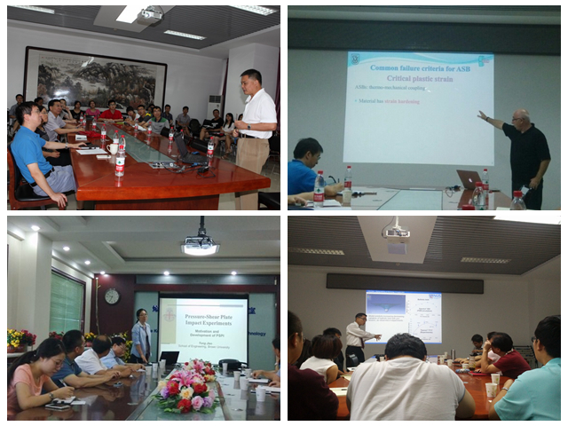在此期间,爆炸科学与技术国家重点实验室先后组织了5场学术报告会。S.F. Li教授作了题为“Multiscale Crystal Defect Dynamics (MCDD): A quasicrystal lattice process zone approach”的报告,提出了材料基因影响材料缺陷的观点,进行了理论推导,并做了深入的分析。D. Rittel教授进行了为期16天的学术访问和交流,就材料动态力学性能作了15个学时的公开授课,并为师生们作了题为“Modelling Adiabatic Shear Failure from Energy Considerations”和“Electro Magnetic Collapse of Thick Walled Cylinders”的学术报告。T. Jiao博士作了题为“Pressure-Shear Plate Impact Experiments”以及“Experimental and Computational Investigation of the Response of an”的报告,详细介绍了压剪炮实验中的关键技术,说明了聚脲材料在高应变率加载条件下的动态力学行为及其在抗爆抗冲击方面的应用。