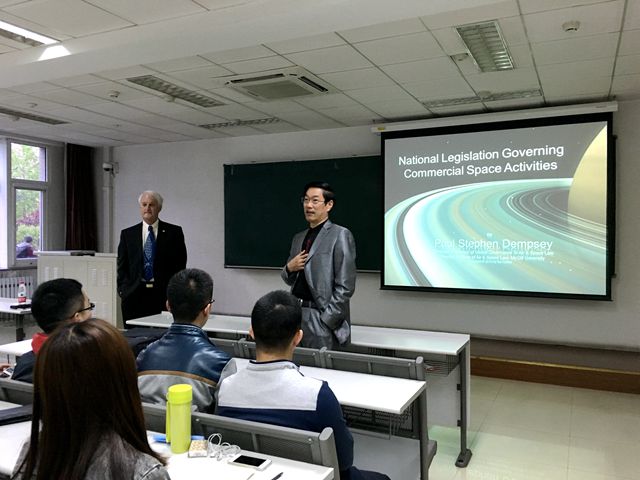 2016年4月14日18点30分,在beat365在线唯一官网登录研究生楼104室,Paul Stephen Dempsey教授为2014级和2015级国际法研究所的研究生带来了一场主题为“National Legislation Governing Commercial Space Activities”的精彩讲座。