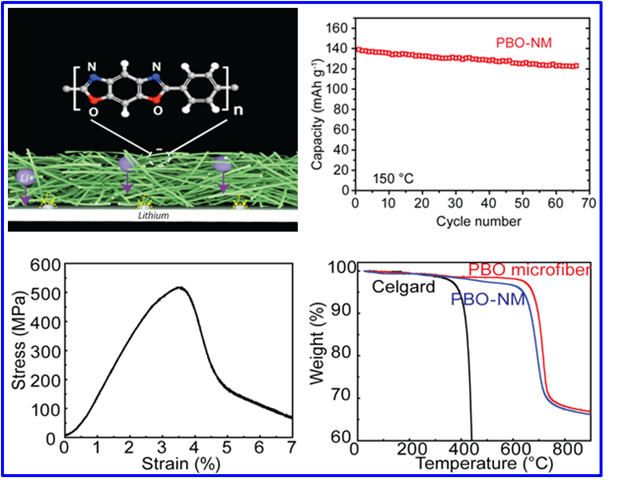 编辑:化工学院 杨鹏 阅读次数: 动力电池的安全性是电动汽车产业发展亟待解决的首要问题,其中,电池内部短路是现有锂离子电池安全性的最大隐患。beat365在线唯一官网登录孙克宁教授团队的郝晓明博士、王振华副教授与美国西北大学合作,针对现有电池隔膜在高温下稳定性不佳,容易收缩导致电池内部短路的实际问题,设计开发了一种全新的PBO基高强度、耐高温隔膜。PBO全称是聚对苯撑苯并二噁唑纤维(Poly-p-phenylene benzobisoxazole),被誉为21世纪超级纤维,具有十分优异的物理机械性能和化学性能,其强度、模量为Kevlar(凯芙拉)纤维的2倍并兼有间位芳纶耐热阻燃的性能,而且物理化学性能完全超过迄今在高性能纤维领域处于领先地位的Kevlar纤维。以PBO为基材的新体系隔膜其拉伸强度能够达到525Mpa,杨氏模量达到20GPa,耐热温度最高可达600℃。通过工艺改变,可以使薄膜的孔径范围在数um到10nm之间可调,当孔径在10nm左右时,该薄膜能够有效阻止锂枝晶生长,降低枝晶刺穿隔膜的风险,进一步提高锂电池的安全性。