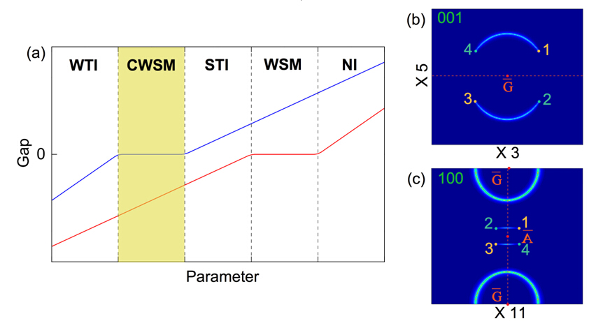图4(a)相图。强弱拓扑绝缘体相变时可出现我们提出的复合Weyl 半金属。而强拓扑绝缘体和能带绝缘体的拓扑相变时可出现通常的Weyl 半金属。(b) 复合Weyl 半金属在(001)解理面的Fermi arc。(c) 复合Weyl 半金属在(100)解理面共存的Fermi arc以及Fermi circle。