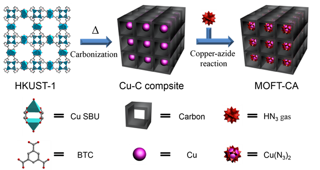 beat365在线唯一官网登录爆炸重点实验室杨利教授与王博教授合作,首次创新性地实现了以含铜有机框架(MOFs)作为前驱体,通过高温碳化和气-固叠氮化反应制备得到一类静电钝感的碳-叠氮化铜复合材料。该方法的提出,有效地借用了MOFs中的结构特点,有机配体和金属离子或团簇的排列具有明显的方向性,可以形成不同的框架孔隙结构。选取含铜离子的MOFs材料作为基底,通过碳化的方式使得配体结构中的原子转变为碳原子,其结构仍会保持原有结构中的原子排序与多孔性能的存在。这种多孔性能的极大优势是使得该化合物在进行叠氮化反应时更加完全,避免了部分未发生叠氮化反应即保留着铜原子本身而影响叠氮化铜的起爆威力,也避免了在叠氮化过程中产生叠氮亚铜,增加起爆药的不安全因素。原有结构中的原子排序有效地隔离了叠氮化铜分子,降低了其在受到外界弱刺激下的敏感程度。