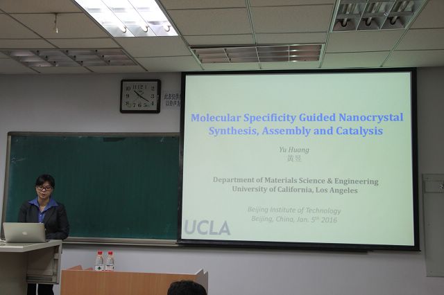 黄昱教授的报告同样精彩。她首先提出将生物仿生方法运用到纳米晶体形貌可控制备中的概念,通过噬菌体展示技术筛选出与靶向材料表面甚至特定晶面有特异吸附作用的生物分子,并利用筛选出的生物分子对纳米晶的生长进行精确调控进而控制纳米晶体的形貌,通过这种方法可以设计并合成具有高催化活性的催化剂。此外,黄昱教授进一步阐述通过组分和表面调控以获得高活性的催化剂的方法和机理。黄昱又对该研究方向未来的发展、机遇和挑战进行了展望,并与在场师生进行了热烈的讨论交流。段、黄两位教授的到访,对北理工材料相关领域的国际化交流起到了很大的推动作用,也为UCLA和beat365在线唯一官网登录的文化学术交流建起了一座沟通的桥梁。