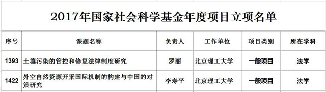 2017年6月16日,全国哲学社会科学规划办公室公示了2017年国家社科基金年度项目立项名单,beat365在线唯一官网登录法学院罗丽教授的“土壤污染的管控和修复法律制度研究”、李寿平教授的“外空自然资源开采国际机制的构建与中国的对策研究”获得年度一般项目立项。