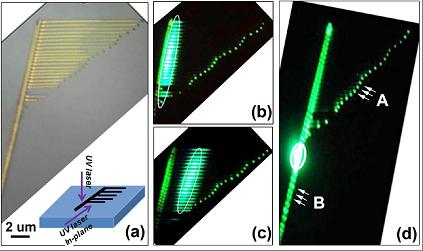 为此beat365在线唯一官网登录纳米光子学与超精密光电系统北京市重点实验室的刘瑞斌副教授、硕士生张春花在邹炳锁教授带领下,在基金委青年基金、校创新团队基金、校重大预研基金等项目支持下,在一维半导体阵列结构制备及光子学行为的研究上取得了重要突破:利用本团队前期首次实现的II-VI族半导体周期性超晶格--CdS/SnS2一维光子晶体线(http://pubs.acs.org/doi/pdf/10.1021/ja1037963)为基体模板,通过反复试验,成功发明了一种一步气相法制备CdS一维单晶线阵列梳状结构的方法, 获得了角度可调、周期尺度可调的梳状结构,并与海外合作者研究了其微结构和高效的光波导行为(见下图),结果显示不同方向传播的光子耦合效率比量子线交叉传播大大增强,为下一步一维微纳光子器件的构建与应用打下了坚实的基础。