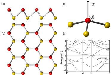硅烯(silicene)是单层硅原子构成的有起伏的二维六角蜂窝结构,硅烯的晶体结构和能带图。(a),(b)分别为侧视图和俯视图。(c)定义了一个起伏角度。(d) 能带图。放大的部分为由于自旋轨道耦合作用在狄拉克点打开的能隙结构。一方面,硅烯由于具有与石墨烯类似的六角蜂窝结构,使得石墨烯中大多数新奇的物理性质,比如低能相对论的线性色散关系,都可以在硅烯中实现;另一方面由于硅烯具有起伏的结构,使得硅烯拥有石墨烯所不具有的一些优异性质。