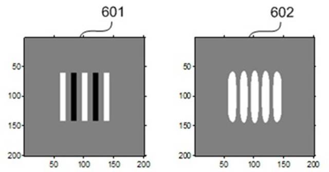 下面三图分别为未优化掩模、采用标量成像模型优化后的相移掩模、采用该课题组自主研发的Abbe矢量成像模型优化后的相移掩模,以及它们对应的光刻胶中成像。