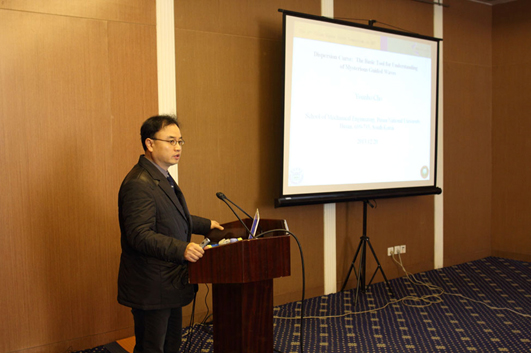 我校机械与车辆学院副院长姜澜教授在开幕式上致辞。韩国无损检测技术协会秘书长、釜山国立大学赵允浩(Younho Cho)教授一行13人参加了本次研讨会。参加本次研讨会的还有中国科学院声学研究所毛捷研究员、北京航空航天大学周正干教授、北京航空材料研究院史亦伟研究员等国内无损检测领域的相关专家和学者40余人。