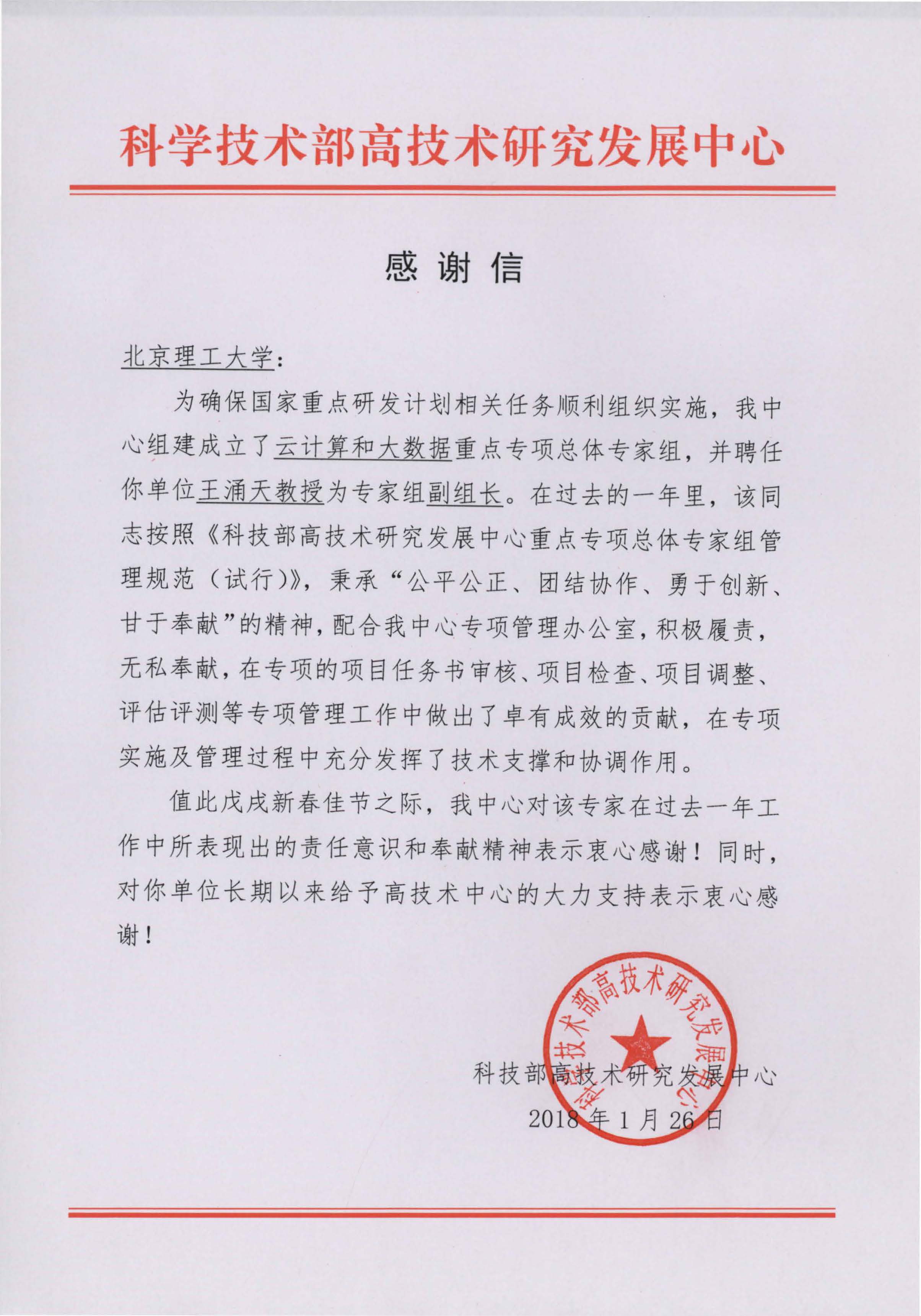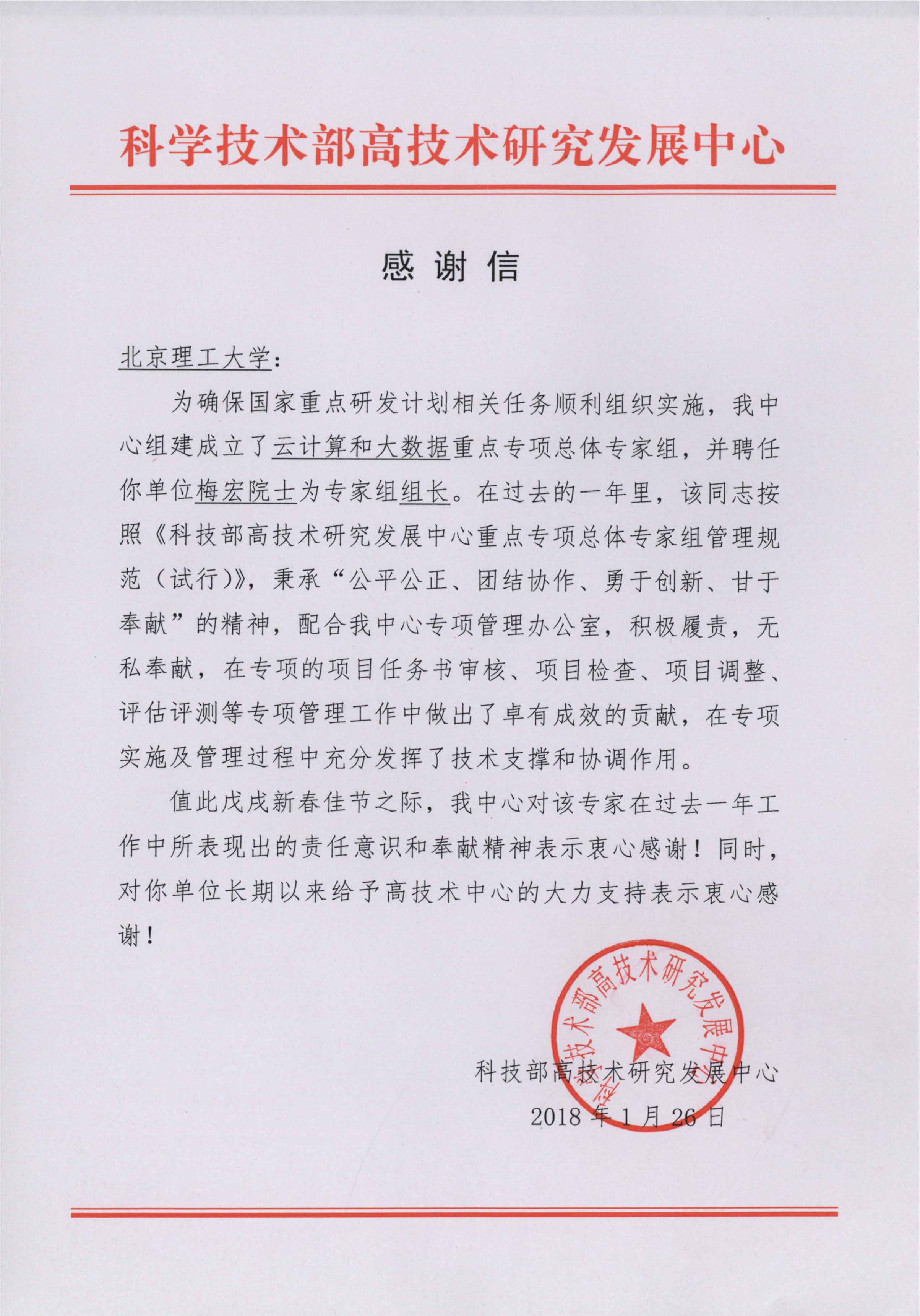 日前,beat365在线唯一官网登录收到科学技术部高技术研究发展中心发来的感谢信,感谢我校梅宏院士、王涌天教授作为云计算和大数据重点专项总体专家组组长、副组长在重点专项管理工作中给予的大力支持。
