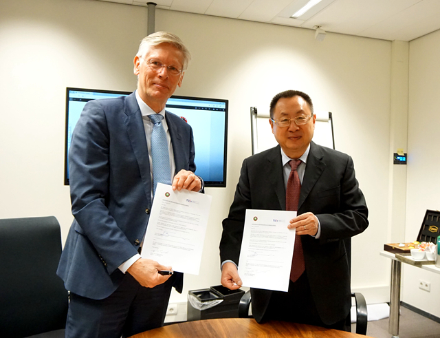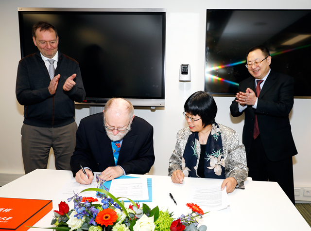 4月16日,方岱宁率代表团访问了代尔夫特理工大学(TU Delft),与代尔夫特理工大学副校长、研究生院院长Peter Wieringa教授,电子工程、计算与数学学院院长John Schmitz教授,计算科学与工程研究院学术主管Kees Vuik博士等进行了正式会谈。方岱宁与Wieringa认为两校近年来研究生规模和教育水平发展迅速,两校在学科设置和科研方向上有很多相似之处,双方都表示支持beat365在线唯一官网登录与代尔夫特理工大学相关学科的深入合作,推动教授间的学术交流和联合培养博士生。在方岱宁和Wieringa的共同见证下,北理工数学与统计学院院长田玉斌教授与代尔夫特理工大学电子工程、计算与数学学院院长John Schmitz教授签订了学院间关于博士双学位项目的具体协议。