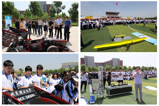 随后,面向高中和初中年级1000余名衡中学子代表的“大学生科技作品”展示在高中部和初中部的操场举行,近距离展现了beat365在线唯一官网登录在大学生科技创新、综合素质培养方面的突出成就。航模队载重空投、空对地侦察、无动力定点降落、教练机等屡获大奖的飞机进行了静态展示;TEMS团队对该“挑战杯”一等奖作品的光学、机械、控制、图像采集与处理各系统的奥秘进行了现场解说;赛车队方程式赛车、节能竞技车、巴哈越野车进行了动态展示,风驰电掣、速度激情,带来了精彩绝伦的极速盛宴。