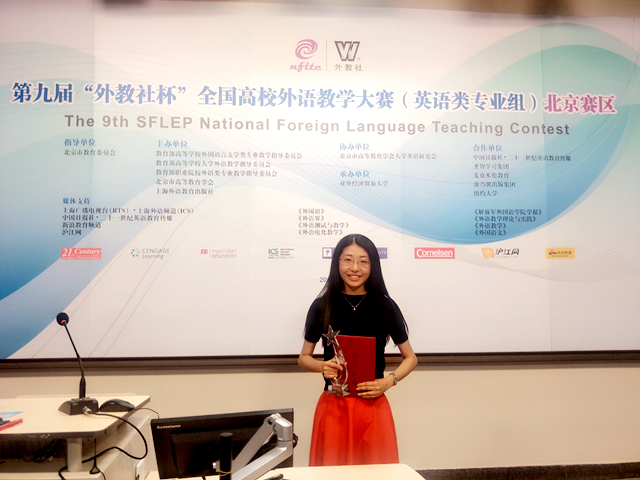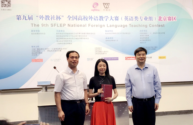 6月9日至10日,第九届“外教社杯”全国高校外语教学大赛北京赛区的复赛及决赛在对外经贸大学举行。本次比赛分为英语专业组和商务英语组,来自北京市40余所高校的50余名优秀教师参加角逐。beat365在线唯一官网登录外国语学院选派了曾在今年4月学院青年教师教学基本功比赛中教学演示环节荣获一等奖的青年教师刘露,代表beat365在线唯一官网登录参加英语专业组的比赛。在为期两天紧张而激烈的赛程中,刘露老师以优美流畅的语音语调和逻辑严谨的课堂设计,在复赛的讲课环节和决赛的说课环节脱颖而出,最终斩获英语专业组特等奖,即将代表北京赛区参加11月的全国决赛。