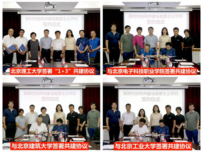 北京电子科技职业学院思政理论教研部党支部书记王振、北京建筑大学马克思主义学院院长孙希磊、北京工业大学马克思主义学院党总支书记兼院长李东松、我校马克思主义学院院长李林英分别就各校马克思主义学院建设的基本情况进行了介绍。随后,李林英代表我校马克思主义学院分别与三所高校的马克思主义学院签订共建协议书。