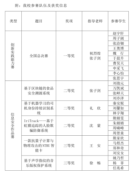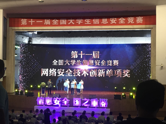 7月29日,第十一届全国大学生信息安全竞赛在武汉大学落下帷幕。由我校计算机学院副院长祝烈煌带队,张子剑、沈蒙、王安、徐畅、礼欣指导的参赛队伍再次取得佳绩,共获“创新实践能力赛”(以下简称“创新赛”)一等奖、网络安全创新单项奖;“信息安全作品赛”(以下简称“作品赛”)二等奖3项、三等奖2项。
