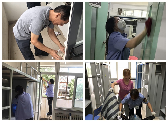 有了“样板间”的参照,全体卫生保洁人员在工作中始终坚持高标准,力争为新生呈现最洁净宿舍。以窗户清洁为例,保洁员们要先用洗涤水双面擦洗玻璃去污,再经过至少两遍清水的清洗,确保没有任何污渍后,再用报纸进行擦拭,以保证玻璃的光亮如新。阳台、地板、门窗、墙壁、床、书桌、衣柜……所有的角落都被认真清洁。经过核算,一位熟练的保洁员要清扫出一间这样的“样板间”宿舍,大约需要6到7个小时,而良乡校区需要保洁的宿舍共有1200余套。面对如此繁重的任务,在今年北京的酷暑中,宿舍运行保障中心的全体工作人员,加班加点,在新生入学前,圆满完成了本科新生1000余套、研究生新生200余套的宿舍清扫工作。