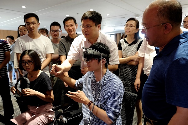 在听取了项目负责人的汇报后,检查组专家对项目取得的基于SLAM的穿透式头戴无障碍呈现装置和虚实融合环境的高效构建平台与呈现系统等阶段性成果进行了体验与检查。