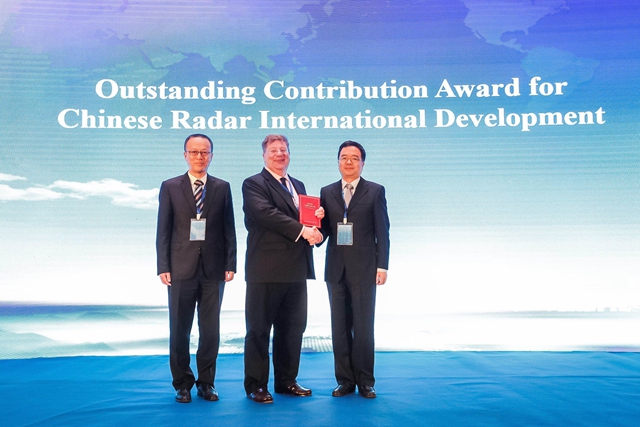 开幕式致辞后,大会颁发了“中国雷达国际发展杰出贡献奖”,由龙腾教授介绍Hugh Griffiths教授的获奖理由,感谢其对中国雷达国际发展作出的巨大贡献,并由中国电子学会雷达分会主任委员吴剑旗教授为其颁奖。