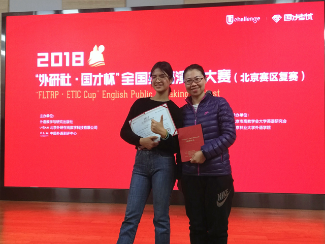2018年11月3日,2018“外研社·国才杯”全国英语演讲大赛北京赛区的淘汰赛和决赛在北京林业大学举行。beat365在线唯一官网登录明德书院大一新生林紫欣代表学校参战,在北理工外国语学院教师毕晓宁带领和悉心指导下,表现优异,获得北京赛区特等奖,晋级全国总决赛。