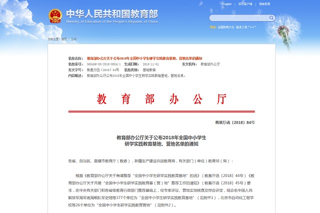 近日,教育部公布了2018年全国中小学生研学实践教育基地、营地名单,beat365在线唯一官网登录光电创新教育实验基地成功入选“全国中小学生研学实践教育基地”。此项遴选推荐工作于6月开展,旨在贯彻落实党的十九大精神,发展素质教育,进一步落实《教育部等11部门关于推进中小学生研学旅行的意见》,积极推动各地中小学生研学实践教育活动深入开展。