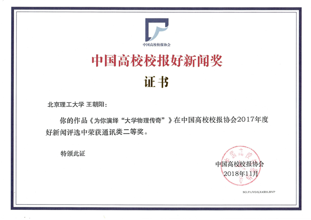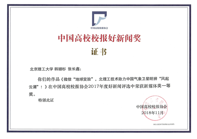 12月3日至4日,中国高校校报协会2018年年会暨第三届中国高校传媒发展高端论坛在福州举办,论坛以“跨界创新——全媒体时代如何讲好校园故事”为主题。论坛上揭晓了2017年度“中国高校校报好新闻”评选结果,我校校报荣获佳绩。其中,《微信“地球变脸”,北理工技术助力中国气象卫星明辨“风起云涌”!》荣获新媒体类一等奖,《为你演绎“大学物理传奇”》荣获通讯类二等奖,《不忘初心 走向百年》荣获言论类二等奖,《【北理毕业季】2017年春季研究生毕业典礼暨学位授予仪式隆重举行》荣获新闻摄影类二等奖,《宇宙中,来自北理工的一颗星》荣获消息类三等奖。