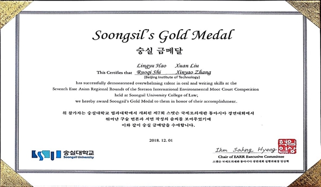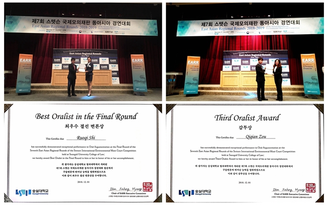 2018年11月28日至12月1日,第23届“史丹森”国际环境法模拟法庭大赛(Stetson’s International Environmental Moot Court Competition,IEMCC)东亚赛区选拔赛(East Asia Regional Rounds,EARR)在韩国崇实大学(Soongsil University)举行。beat365在线唯一官网登录法学院代表队一路过关斩将,力克群雄,最终勇夺冠军,并获得了赴美国参加全球总决赛的资格。本次大赛中,石若琪同学获得了总决赛最佳辩手(Best Oralist in the Final Round),邹祺芊同学获得最佳辩手第三名(Third Oralist)。