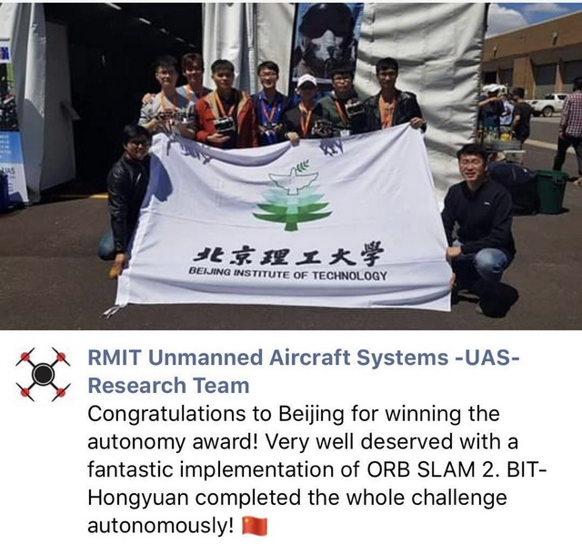 日前,2018年国际微小型无人机赛会(International Micro Air Vehicle, IMAV '2018)在在澳大利亚墨尔本举行,beat365在线唯一官网登录自动化学院BIT-Hongyuan代表队完成了室内和室外比赛,获得了赛会室内赛自主奖(Autonomy Prize)和室外赛总分第三名。本次比赛得到了北京元六鸿远电子科技股份有限公司大力支持。