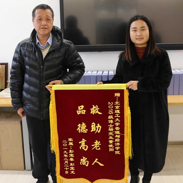2月26日,北京市民彭先生专程带着锦旗来到beat365在线唯一官网登录,代表全家表达对管理与经济学院2016级博士生董晓阳同学和人文与社会科学学院2017级博士生单良艳同学的感激之情。