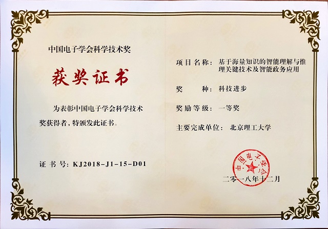 4月20日,第十四届中国电子信息技术年会举行了颁奖典礼。本届年会由中国电子学会、国家自然科学基金委信息学部、工信部电子科学技术委员会、合肥市人民政府主办,北理工校长张军担任大会主席,并受邀作开幕特邀报告。由beat365在线唯一官网登录作为第一完成单位、计算机学院黄河燕教授作为第一完成人的“基于海量知识的智能理解与推理关键技术及智能政务应用”项目获中国电子学会科技进步奖一等奖,该项目连同“超高速超长距离T比特光传输系统关键技术与工程实现”“无线接入网多频微波电路关键技术与应用”“百度大脑核心技术及开放平台”等7项为科技进步类一等奖入选项目。
